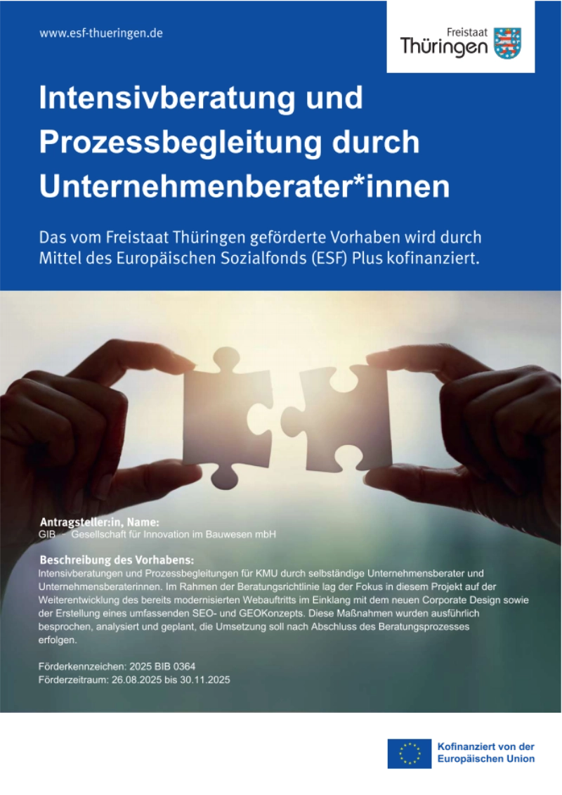 Gemäß der Beratungsrichtlinie des Freistaates Thüringen erhält das Unternehmen eine Förderung für Beratungen und Prozessbegleitungen, die Strategien zum Aufbau bzw. für eine nachhaltige positive Entwicklung und Sicherung von KMU unterstützen. Die Ergebnisse und Handlungsempfehlungen werden in einem Beratungsbericht festgehalten. Im Rahmen der Beratungsrichtlinie lag der Fokus in diesem Projekt auf der Weiterentwicklung des bereits modernisierten Webauftritts im Einklang mit dem neuen Corporate Design sowie der Erstellung eines umfassenden SEO- und GEOKonzepts. Diese Maßnahmen wurden ausführlich besprochen, analysiert und geplant, die Umsetzung soll nach Abschluss des Beratungsprozesses erfolgen.